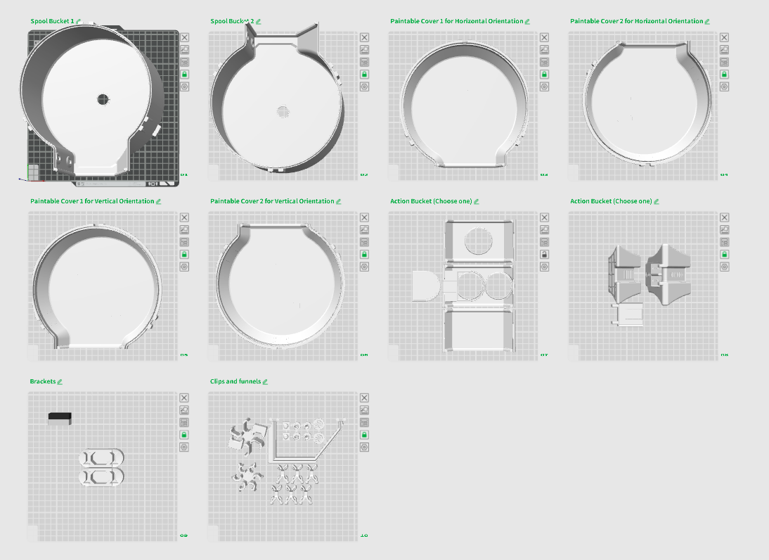 | 7 | 二つのスプールの間になる部品で、湿度計を入れるか入れないかで印刷するものが変わる。 入れない時は一番下、一つだけ入れる(カバー内部の湿度を測定する)ときは上、二つ入れる(カバー内部とカバー外部の湿度を測定する)時は真ん中の二つの部品を印刷する。 湿度計については作品ページにリンクがある。 |