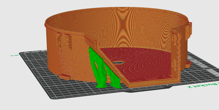 が、途中で印刷が失敗し糸だらけになってしまった。観察するとオーバーハングしている部分が垂れてしまっていてそこから印刷が狂い始めたようだ。デフォルトだとサポート材は無しの設定だったので