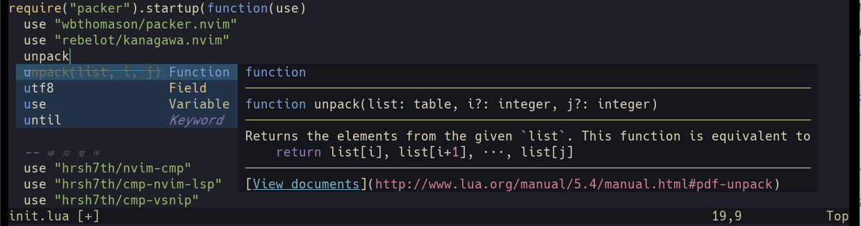 これで LSP は動くようになりましたが、補完を行うには補完プラグインを入れる必要があります。Vim には様々な補完プラグインがありますが、LSP への対応度が高いnvim-cmpがおすすめです。この記事ではこれを使用します。