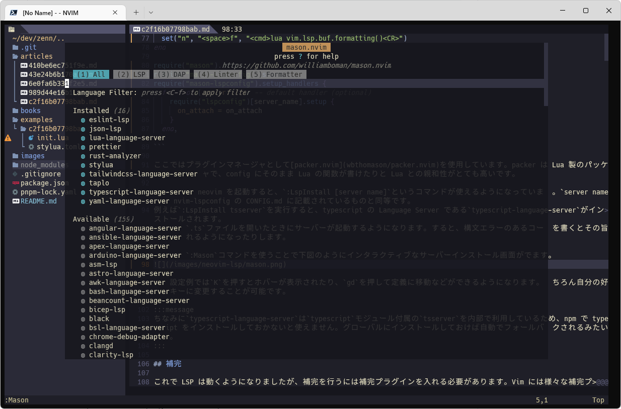 インストール後には、mason.nvimにより:LspInstall [server name]というコマンドが使えるようになっています。