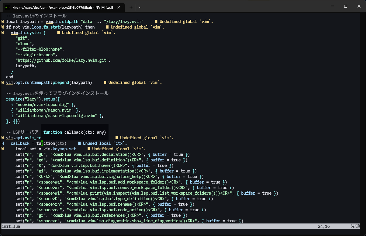 完了後、一旦Neovimを再起動してinit.luaを開くと自動で言語サーバが起動するはずです。LSPによる診断が表示され、上でも説明したようにKでホバーを出すこともできます。