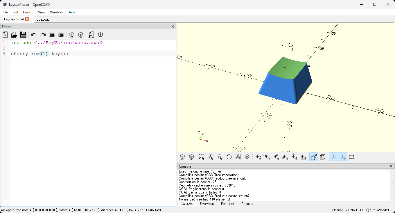 このようにOpenSCADはCADであるだけではなくプログラミング言語であり、ライブラリを読み込むことができます。その一つがキーキャップ生成用ライブラリであるKeyV2です。これを用いると非常に簡単にキーキャップを生成できます。 残念ながら現在は開発が停止しているようですが、十分使うことができます。
