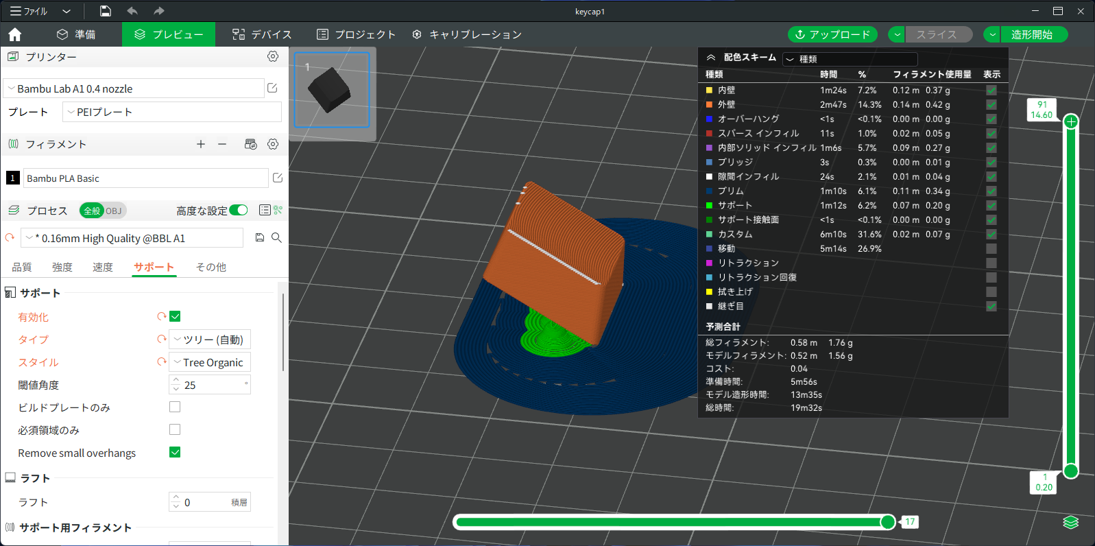- サポートの閾値角度はプリンター等によって変わってくると思います。上図ではキーキャップを30度傾けましたが、閾値25度でダレたりすることは特にありませんでした。